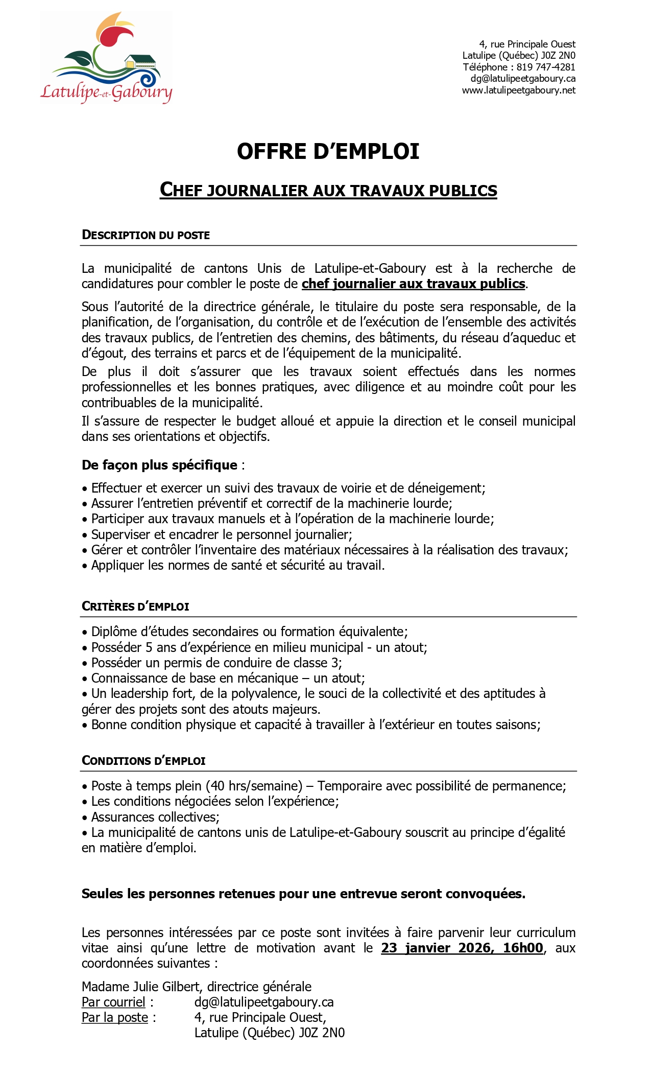 Pour les urgences, contactez les travaux publics au 819 629-1453